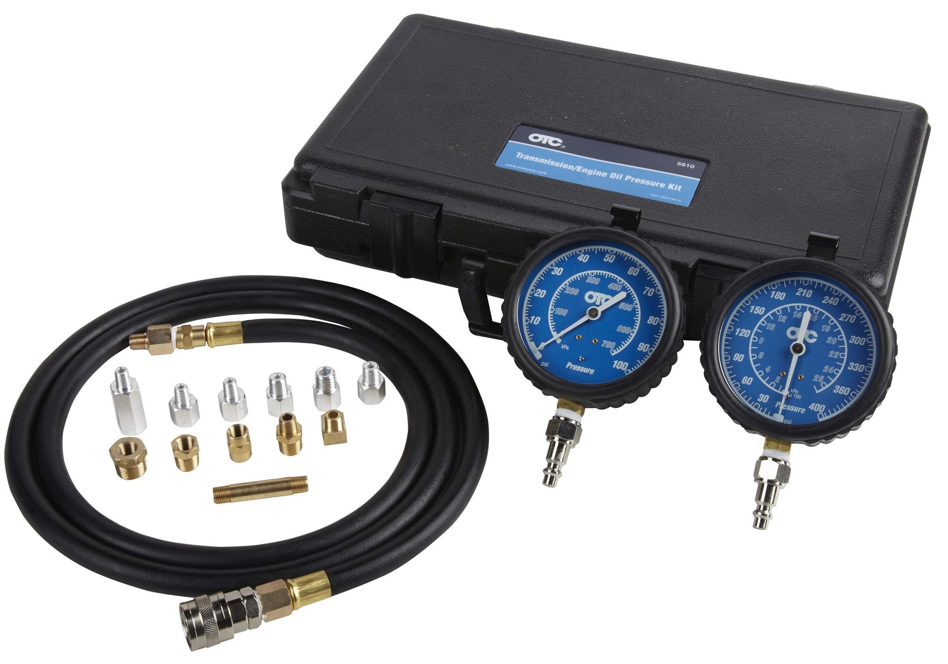 OTC’s 5610 Transmission/Engine Oil Pressure Testing Kit is designed for static and/or on road testing and can be used on both domestic and import applications